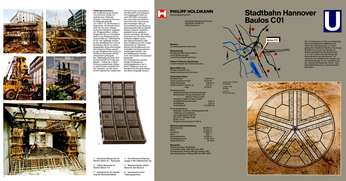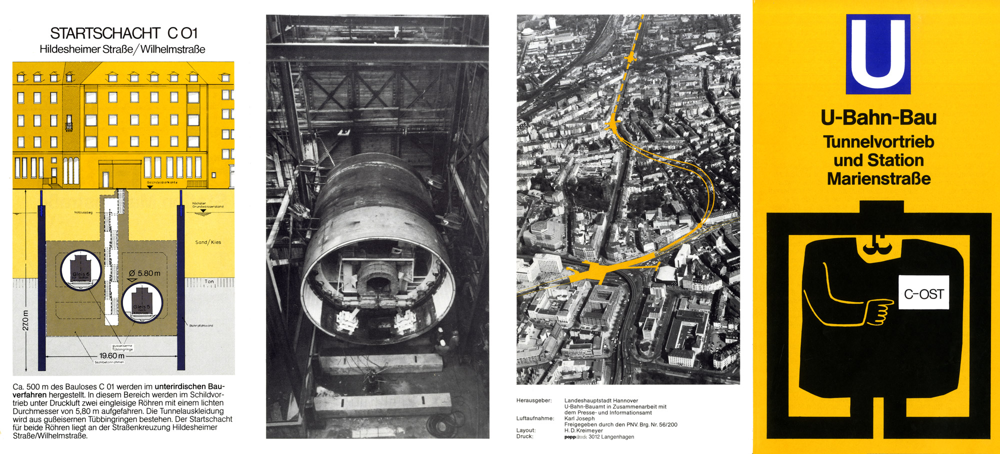 In dieser Infobroschüre aus dem Jahr 1985 wird das Baulos C 01 Schildvortrieb (Aegi Richtung Marienstraße) in einem 2½-fachen Klappbroschüre detailliert vorgestellt, inklusive detaillierten technischen Zeichnungen, Längsprofil und Querschnitte der Strecke mit weiteren Fotos der Baugrube.