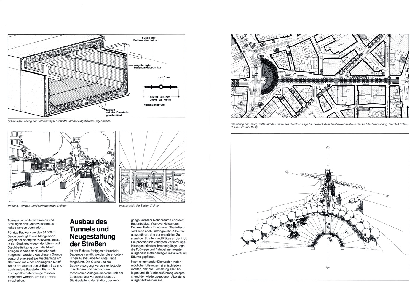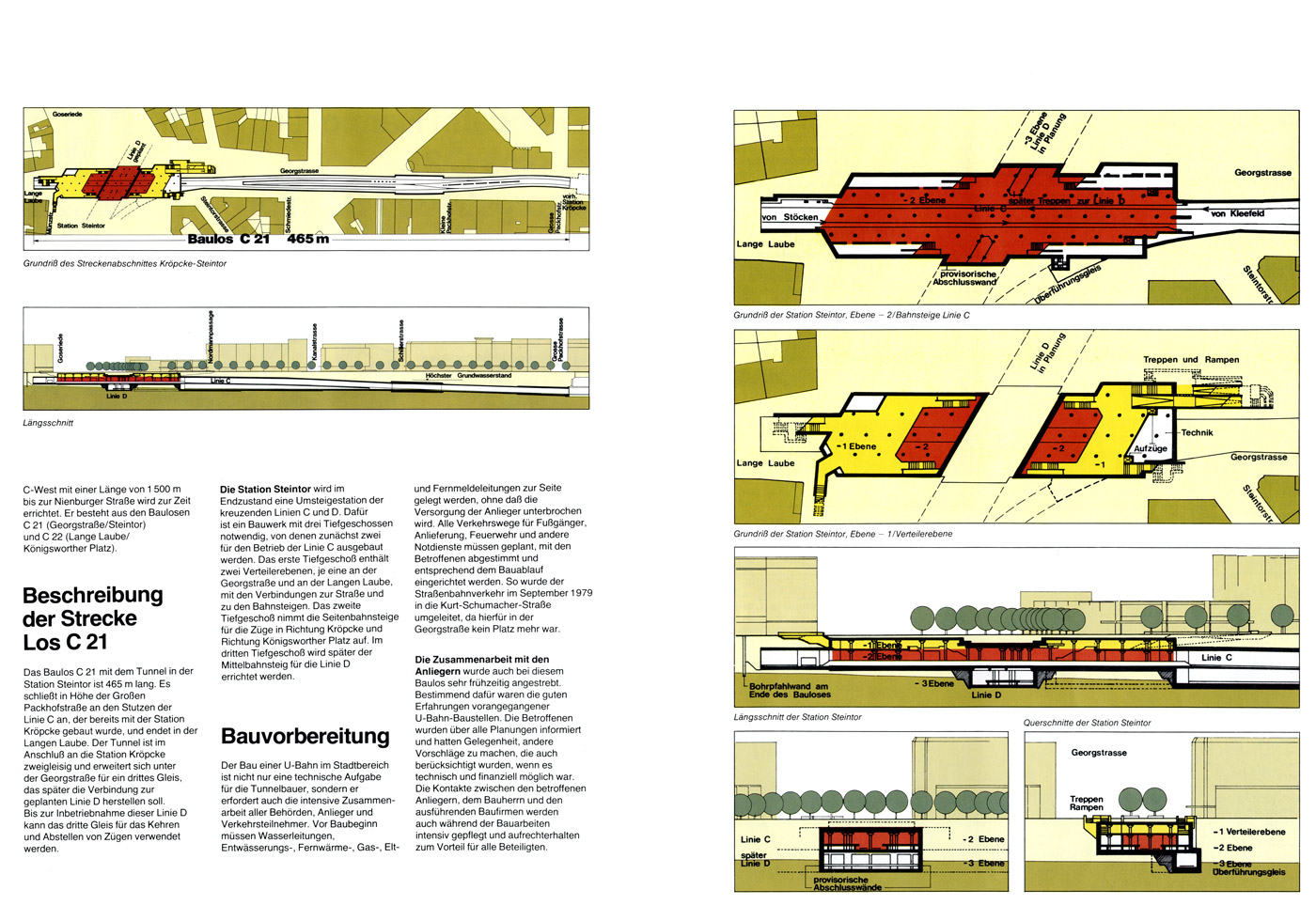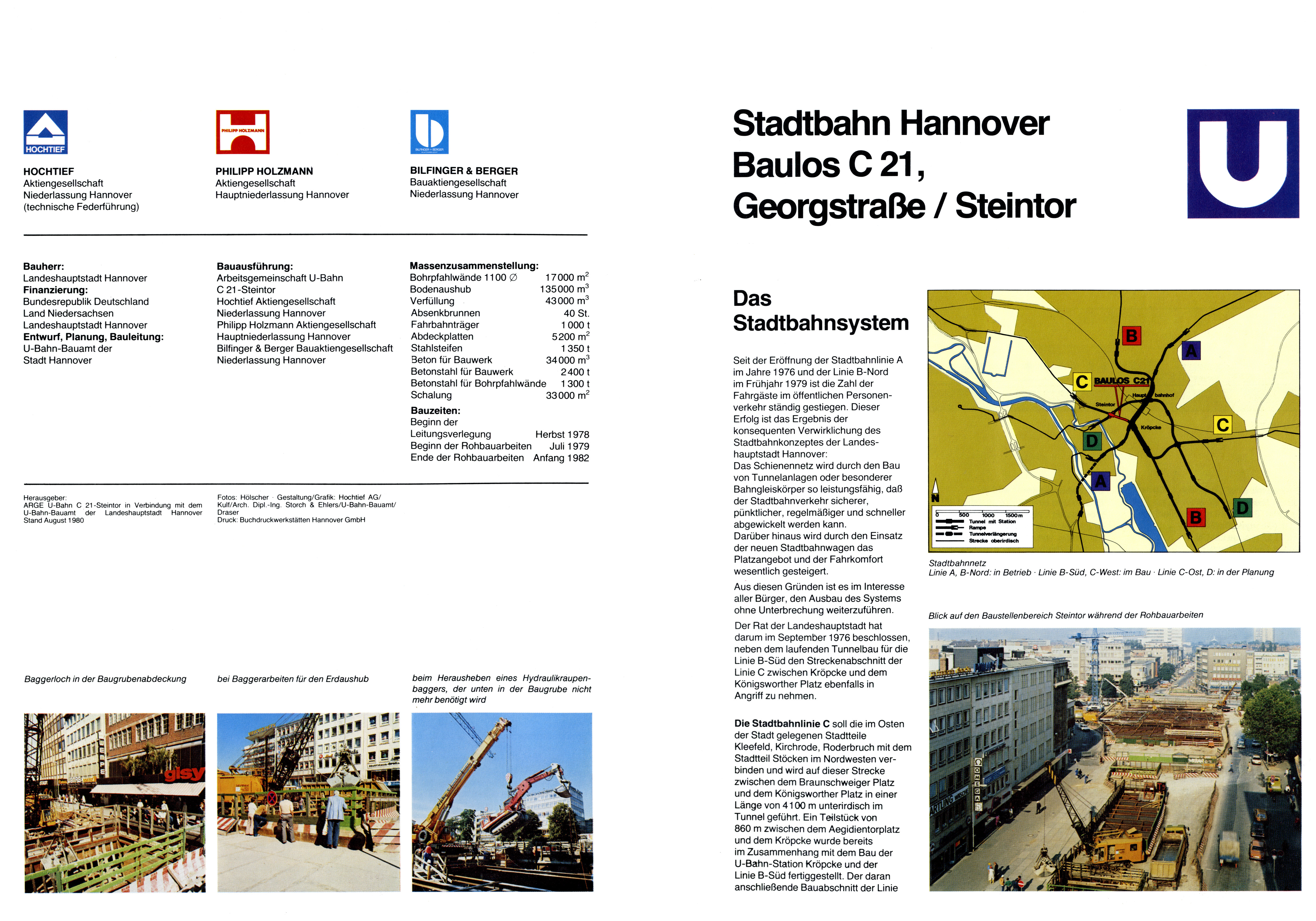 In dieser Infobroschüre aus dem Jahr 1980 wird das Baulos C 21 entlang der Georgstraße mit der Station Steintor detailliert vorgestellt, inklusive Bauzeitenplan und Neugestaltung des Steintor-Platzes mit der Georgstraßenachse.