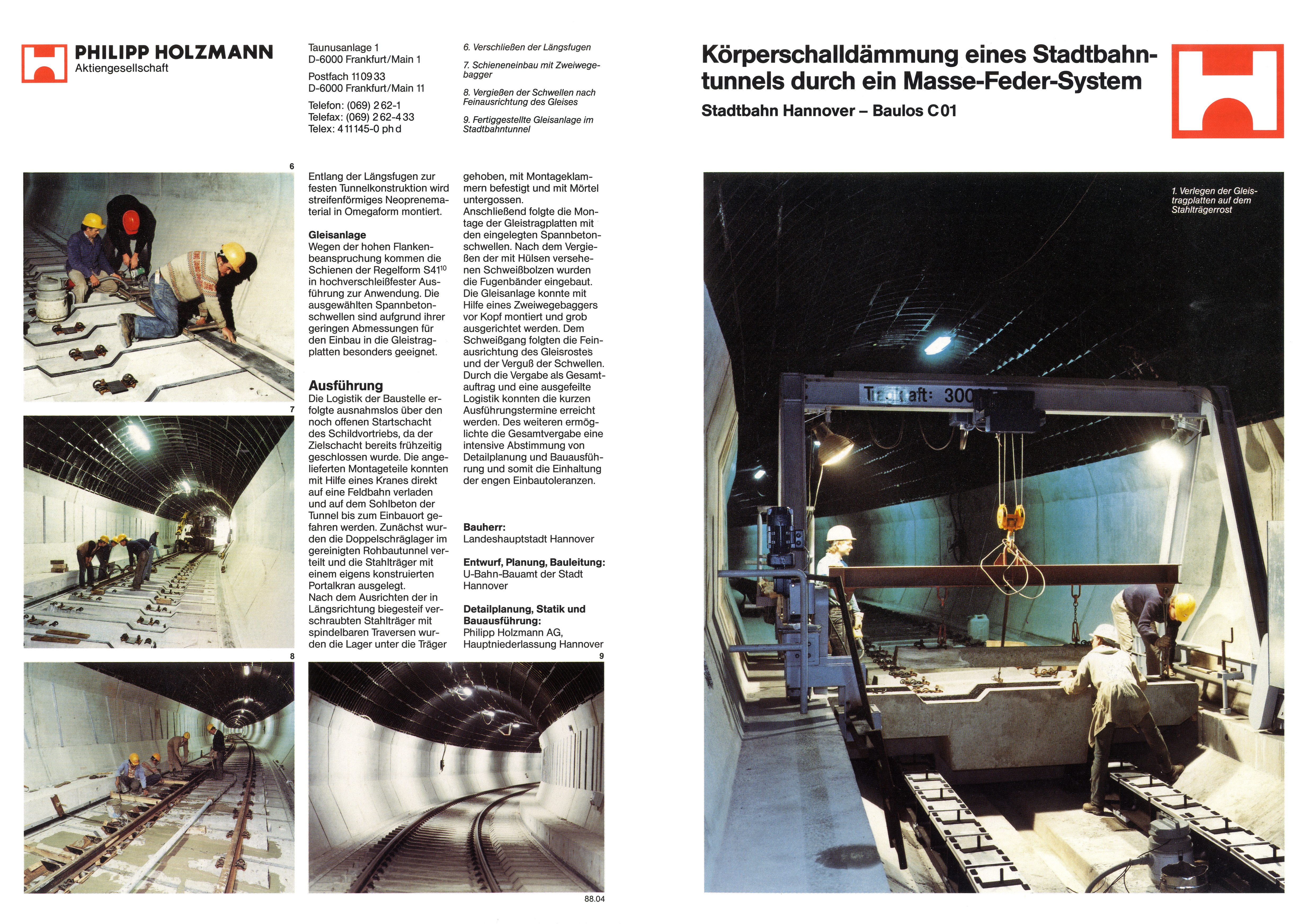 In dieser Infobroschüre aus dem April 1988 wird für das Baulos C 01 das Masse-Feder-System vorgestellt, das als neuartiger Konstruktion eines Schienenwegs im Tunnel für Schall- und Erschütterungsschutz dienen soll.