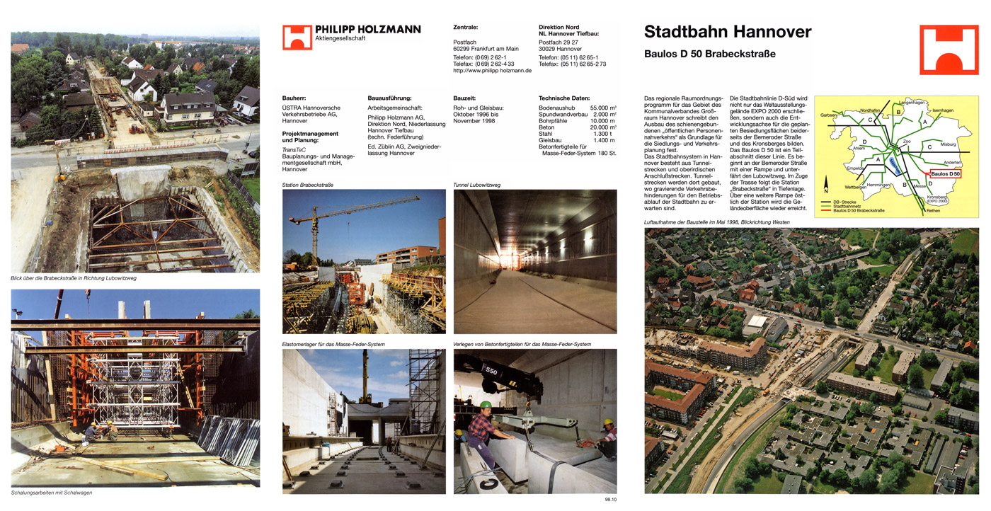 In dieser Infobroschüre aus dem Oktober 1998 wird auf 2½ Seiten der weitere Baustellenfortschritt auf dem Baulos A 50 Brabeckstraße mit dem Tunnel Lubowitzweg und der Station Brabeckstraße gezeigt. Neuere Fotos zeigen die fertigen Tunnelabschnitte sowie die Verlegung des Masse-Feder-Systems für die Schienen.